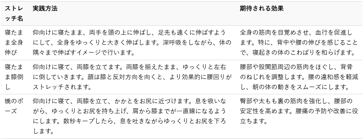 朝起きたばかりの体は、寝ている間に同じ姿勢を保っていたことで固まっていることがあります。目覚めのストレッチは、体をゆっくりと目覚めさせ、血行を促進し、腰痛を予防するために非常に有効です。ベッドの上でできる簡単な動きから始め、一日を快適にスタートさせましょう。