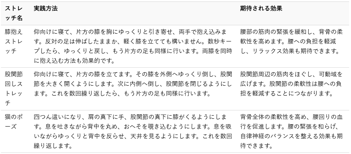 腰痛の改善には、寝方や寝具の見直しが非常に重要ですが、それだけでは不十分な場合があります。日々のセルフケアを取り入れることで、寝ている間に蓄積された体の負担を軽減し、腰痛の予防や緩和につなげることができます。特に、寝る前と起きた後に行う簡単なストレッチは、腰回りの筋肉をほぐし、血行を促進するために効果的です。また、日常生活での姿勢を意識することも、腰への負担を減らす上で欠かせない習慣となります。