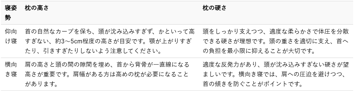 枕の高さと硬さは、首の骨が背骨の延長線上にあるような状態を保つために欠かせない要素です。仰向け寝と横向き寝、それぞれの寝姿勢に合わせた選び方のポイントを理解しましょう。