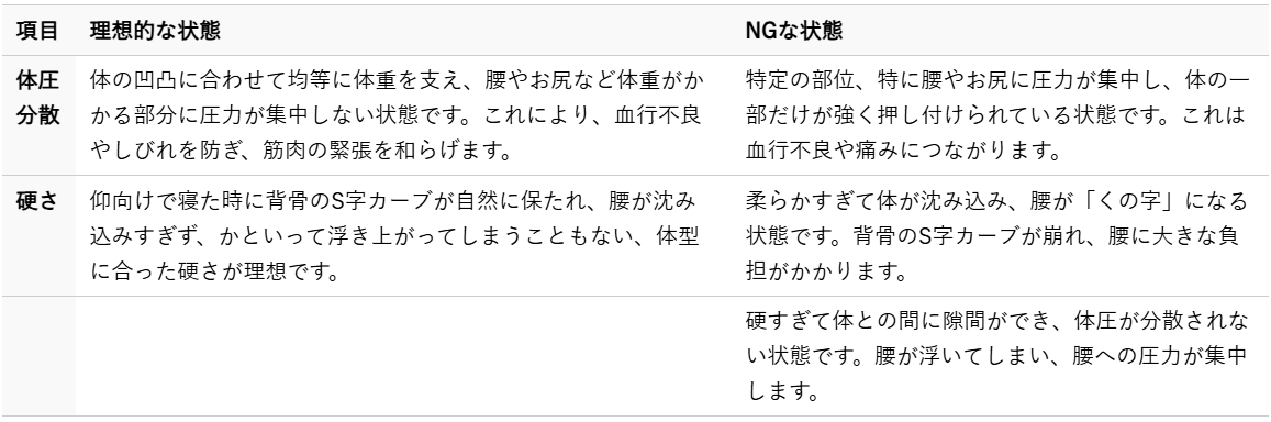 マットレス選びで最も重要なのは、全身の体重を均等に支え、特定の部位に圧力が集中しない「体圧分散」と、あなたの体型に合った「硬さ」です。この二つの要素が適切であることで、寝ている間も背骨の自然なアライメントを保ち、腰への負担を軽減することができます。