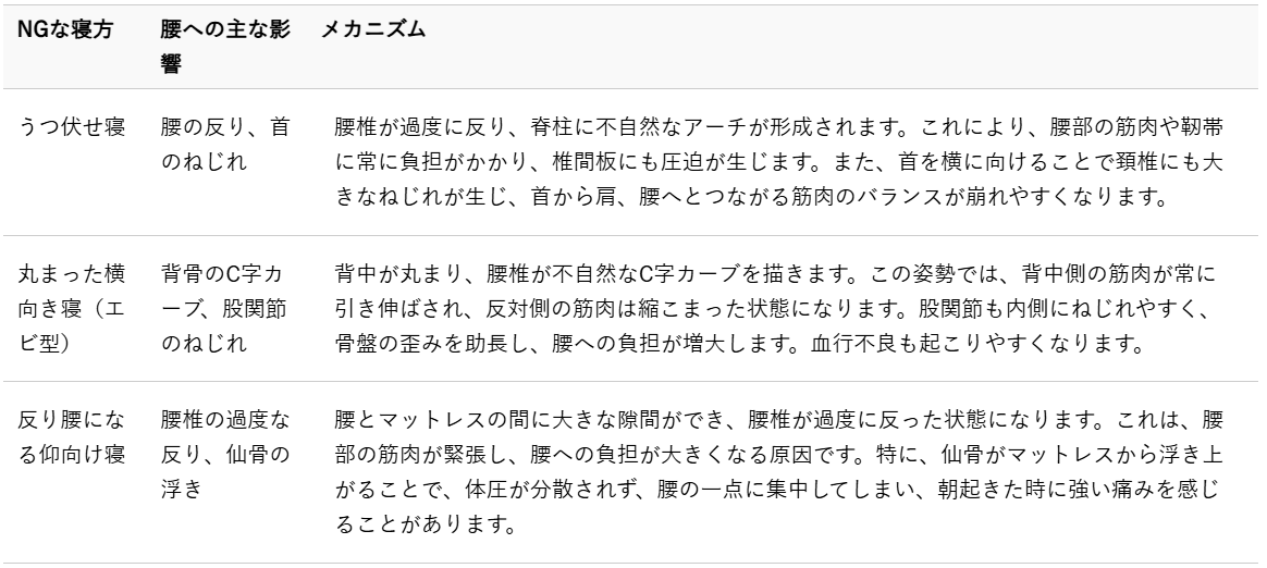 具体的なNGな寝方とそのメカニズムを以下の表にまとめました。