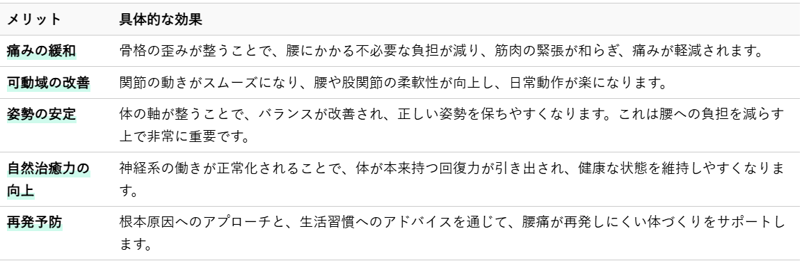 カイロプラクティックの施術によって骨格の歪みが整えられることで、腰痛の改善だけでなく、以下のような様々なメリットが期待できます。