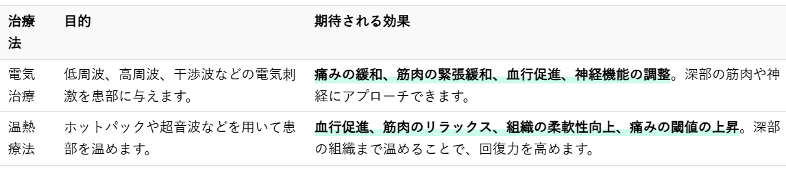 手技による施術と並行して、物理療法として電気治療や温熱療法を組み合わせることで、より効果的な症状の改善を目指します。