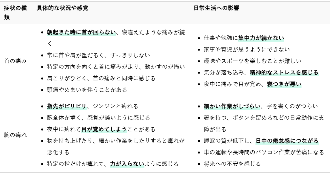 首の痛みや腕の痺れは、日常生活に大きな影響を及ぼし、多くの方が悩まれている症状です。これらの不快な感覚は、日々の活動を制限し、精神的なストレスにもつながることが少なくありません。