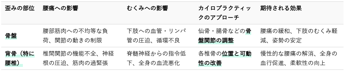 以下に、骨盤と背骨の歪みが腰痛とむくみに与える影響と、カイロプラクティックのアプローチをまとめました。