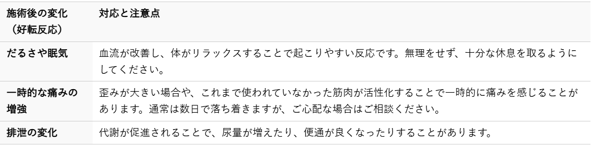 施術後には、体が変化しようとする過程で様々な反応が現れることがあります。これらは一般的に好転反応と呼ばれ、体が良い方向へ向かっているサインと考えられます。
