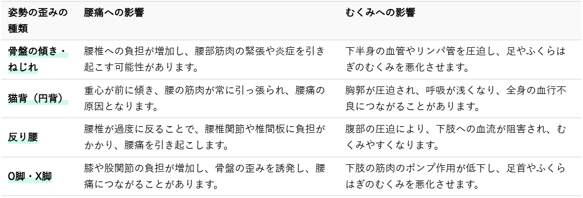 以下に、代表的な姿勢の歪みと、それが腰痛・むくみに与える影響をまとめました。