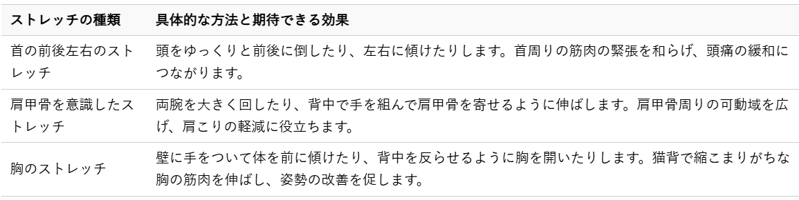 運動不足は血行不良を招き、肩こりや頭痛の原因になります。ウォーキングや軽い体操など、無理のない範囲で体を動かす習慣をつけましょう。体が温まり、血行が促進されることで、筋肉の緊張が和らぎます。