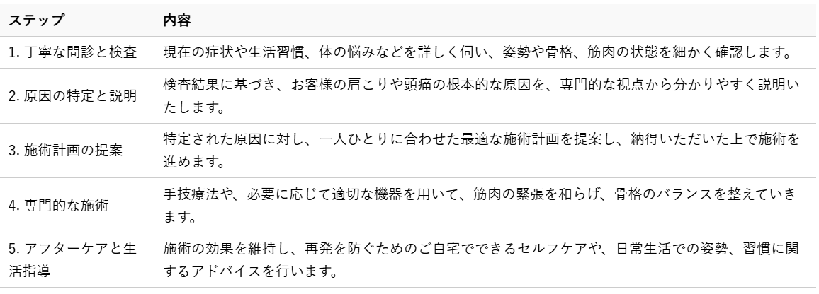そのような時は、専門家である整骨院にご相談いただくことをお勧めいたします。整骨院では、お客様一人ひとりの身体の状態を丁寧に評価し、肩こりや頭痛の根本的な原因を見極めます。そして、その原因に対して専門的なアプローチを行うことで、単なる一時的な症状の緩和だけでなく、再発しにくい身体づくりをサポートし、根本から見直すことを目指します。