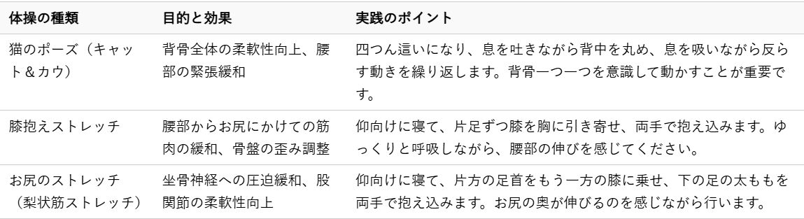 これらのストレッチは、痛みを感じない範囲で、ゆっくりと、呼吸に合わせて行うことが大切です。毎日続けることで、腰部の柔軟性が高まり、慢性的な痛みの軽減につながります。