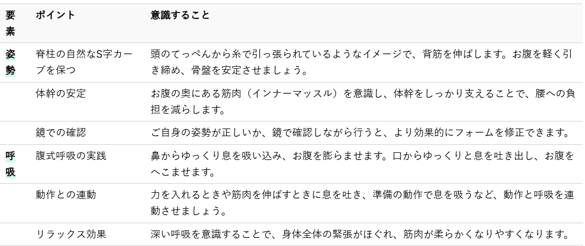以下に、正しい姿勢と呼吸のポイントをまとめました。