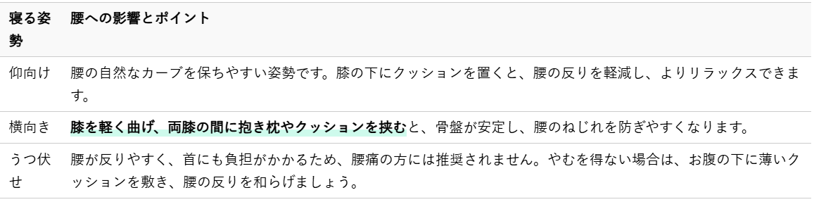 寝る姿勢も腰痛に大きく影響します。一般的に、仰向けで膝を軽く曲げた姿勢や、横向きで膝を軽く曲げ、抱き枕などを挟んだ姿勢が腰への負担が少ないとされています。うつ伏せ寝は、腰が反りやすく、首にも負担がかかるため、腰痛のある方にはあまり推奨されません。もしうつ伏せでしか眠れない場合は、お腹の下に薄いクッションを敷くなどして、腰の反りを軽減する工夫も考えられます。