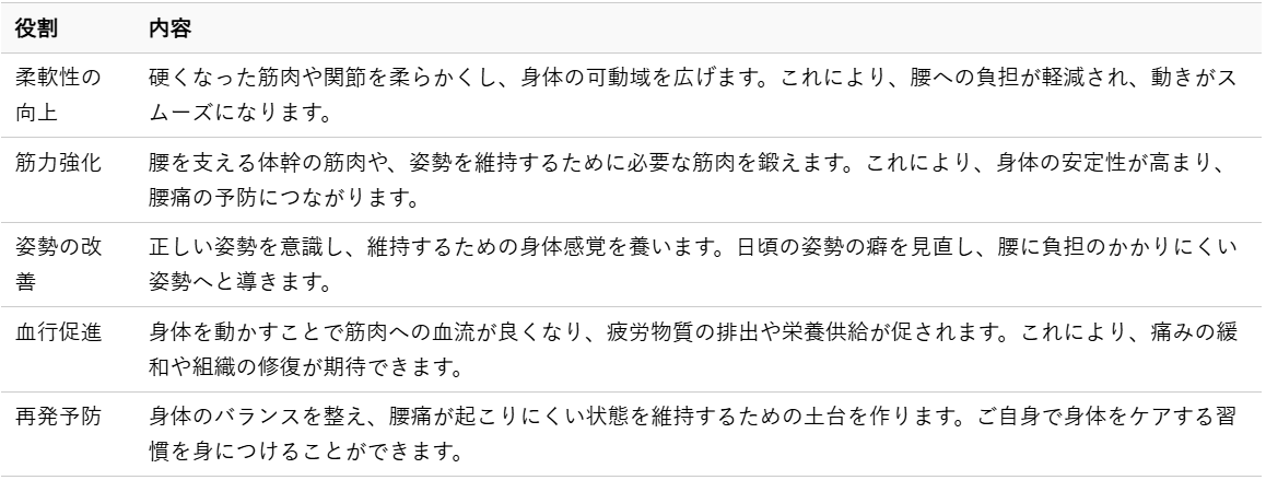 腰痛体操が腰痛改善に果たす具体的な役割は、多岐にわたります。以下にその主な役割をまとめました。