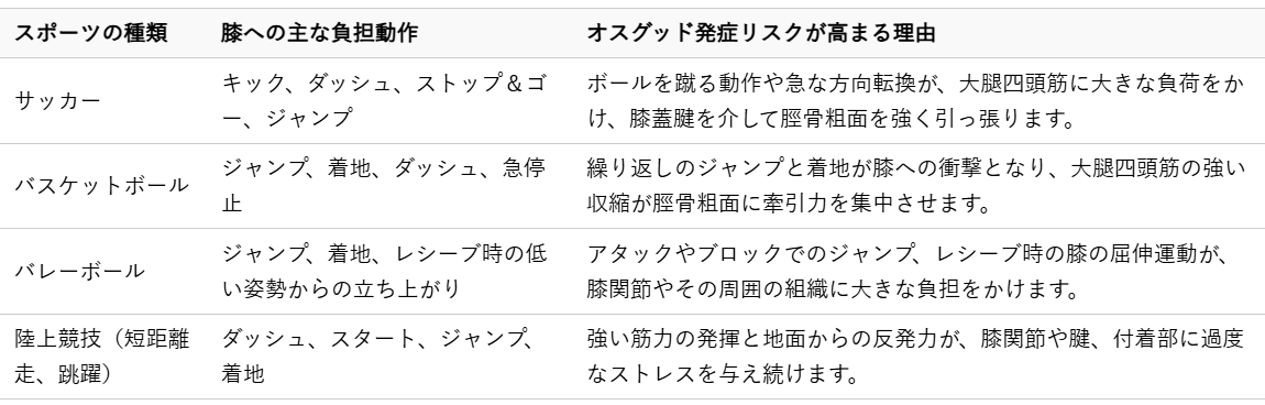 以下に、オスグッド病と関連が深いスポーツの例とその主な動作をまとめました。