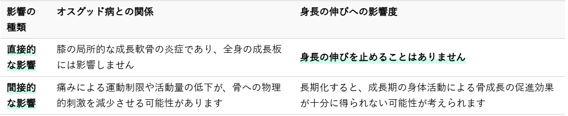 しかし、これはあくまで間接的な影響であり、オスグッド病が治癒すれば、再び活発な運動が可能となり、成長期に必要な刺激を十分に得られるようになります。重要なのは、痛みを我慢して無理に運動を続けることではなく、適切な対処をすることです。