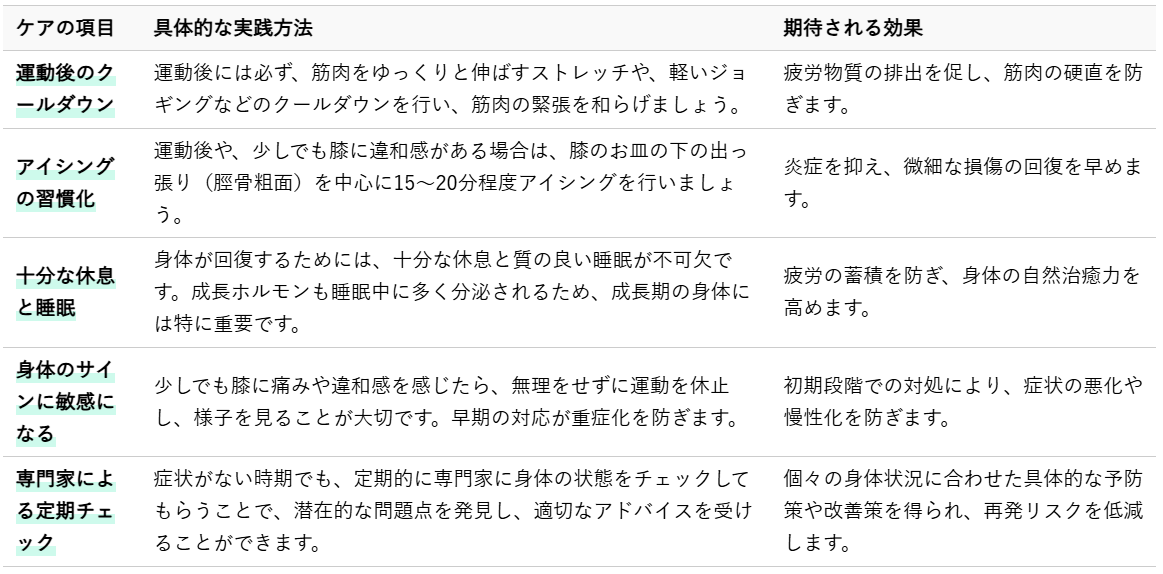 日々の継続的なケアと、身体の変化に合わせたメンテナンスが、オスグッド病の予防と再発防止には欠かせません。症状がない時期でも、積極的に身体を労わる習慣を身につけましょう。