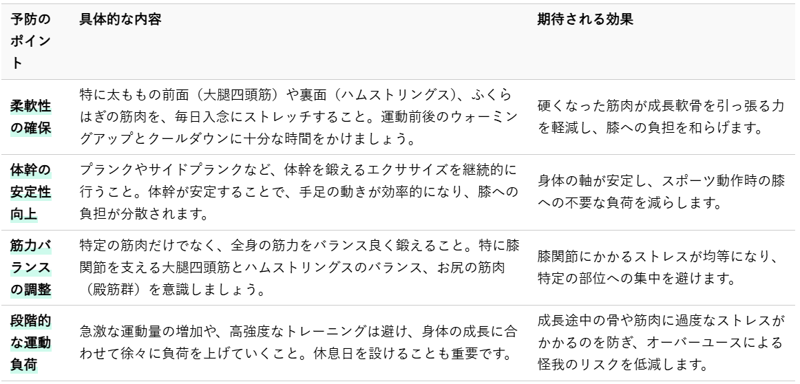 成長期は骨が急速に伸びる一方で、筋肉や腱の成長が追いつかないことでアンバランスが生じやすい時期です。この時期に適切な身体づくりを行うことが、オスグッド病の予防に繋がります。