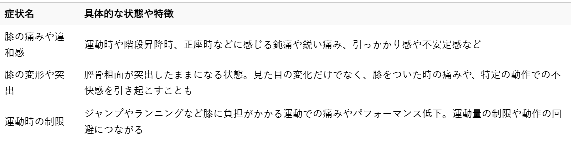 オスグッドの後遺症として現れる症状は多岐にわたりますが、特に以下の3つが代表的です。