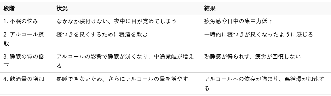 アルコール摂取と不眠症の悪循環を具体的に見てみましょう。