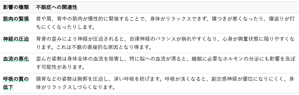 姿勢の歪みが不眠症に与える具体的な影響は、以下の通りです。