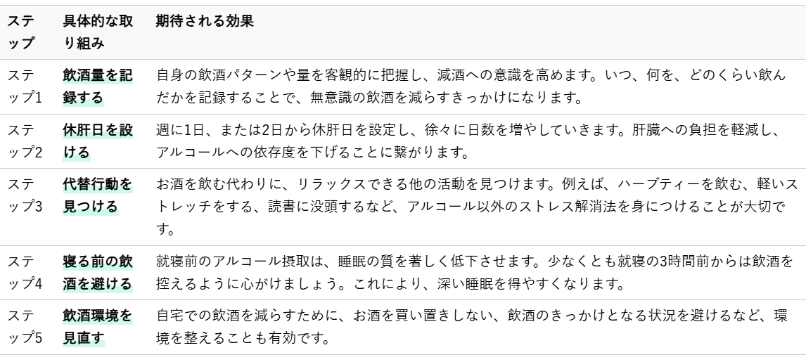 長年の飲酒習慣を急に断つことは、心身に大きな負担をかける可能性があります。そのため、無理なく段階的にアルコール摂取量を減らしていくことが大切です。以下のステップを参考に、ご自身のペースで取り組んでみてください。