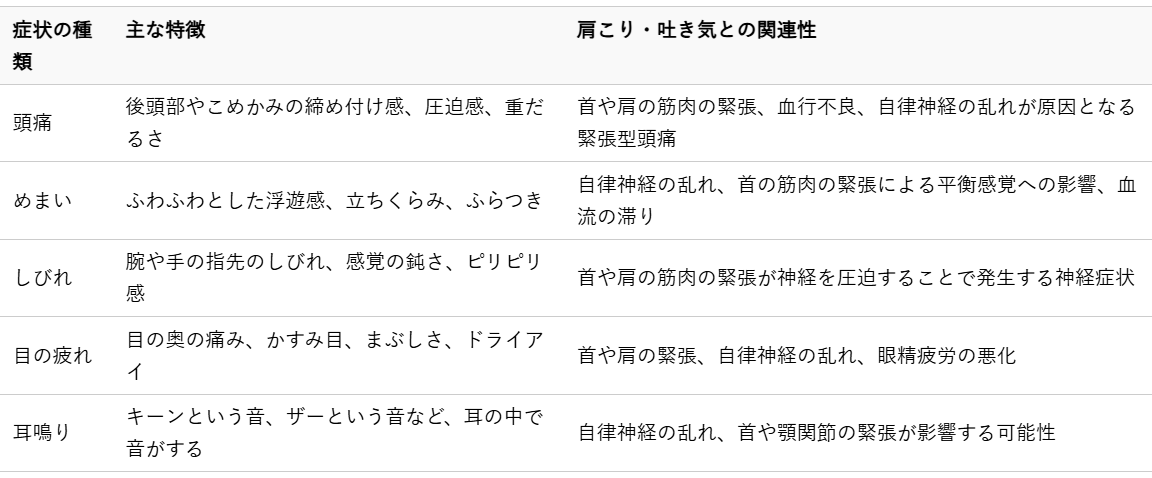 以下に、肩こりや吐き気と関連して現れやすい症状とその特徴、そして関連性についてまとめました。