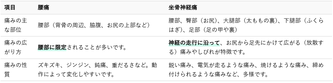 腰痛と坐骨神経痛を区別する上で、痛みがどこに出て、どのように広がっていくのかを知ることは非常に重要です。それぞれの症状が持つ特徴を理解しましょう。