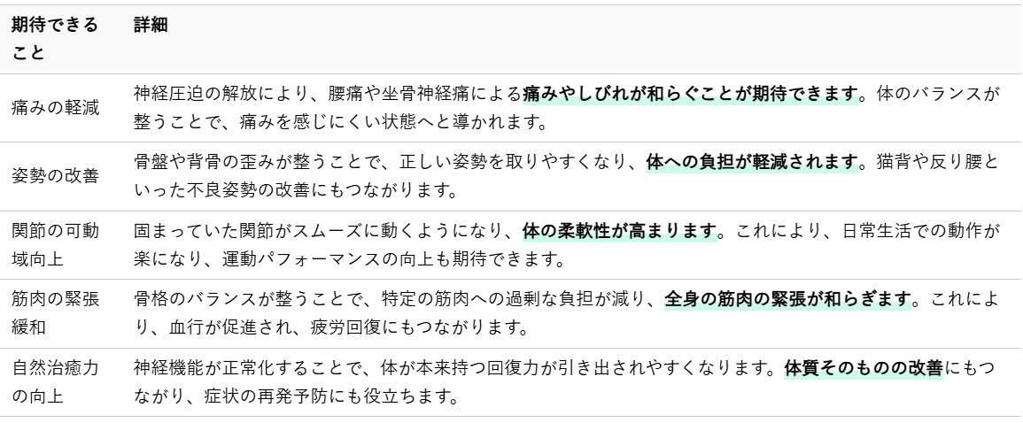 具体的には、腰の痛みの軽減、坐骨神経痛によるしびれの緩和、股関節や腰部の可動域の改善、姿勢の安定などが挙げられます。身体の歪みが整い、神経機能が正常に働くようになることで、本来持っている自然治癒力が向上し、症状の根本的な改善へと繋がります。