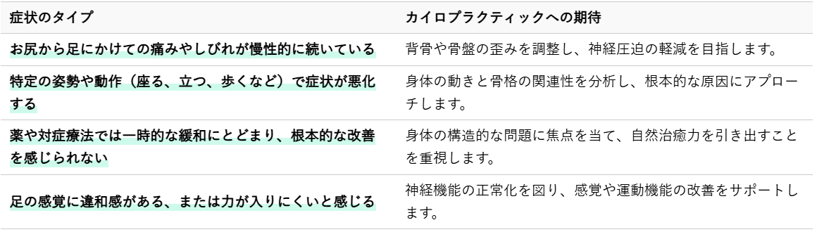坐骨神経痛は、お尻から足にかけて広がる痛みやしびれが特徴です。特に、以下のような症状でお悩みの場合、カイロプラクティックが改善への道を開く可能性があります。