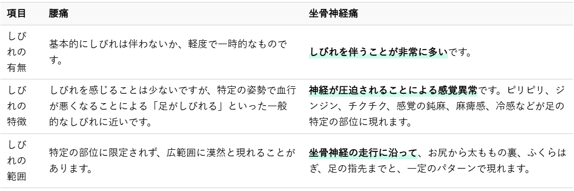 しびれの有無は、腰痛と坐骨神経痛を見分ける上で、最も重要なポイントの一つと言えます。しびれは神経が圧迫されているサインであり、坐骨神経痛に多く見られる症状です。