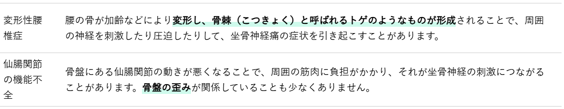 坐骨神経痛は、様々な原因によって引き起こされます。多くの場合、腰椎や骨盤周辺で坐骨神経が圧迫されたり、炎症を起こしたりすることで発症します。ここでは、特に坐骨神経痛の原因となりやすい主な疾患についてご説明します。