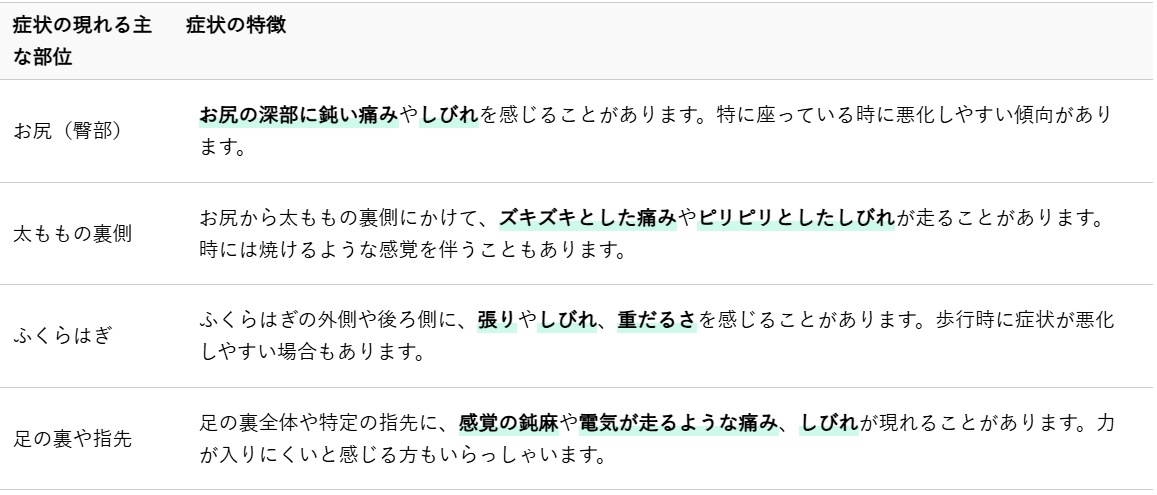 - 足にピリピリ、ジンジンといったしびれや、感覚の鈍麻がある場合:坐骨神経痛の可能性が高いです。足の指先や特定の部位にしびれが集中しているか確認してください。