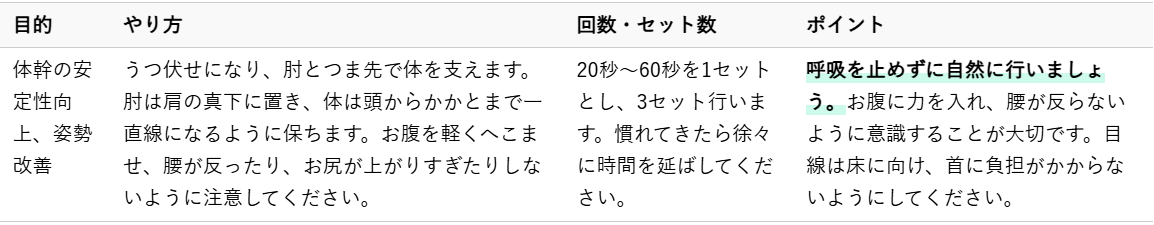 プランクは、腹筋や背筋、お尻の筋肉など、体幹全体を効率良く鍛えられる基本的なトレーニングです。特別な道具は必要なく、ご自宅で手軽に行えます。