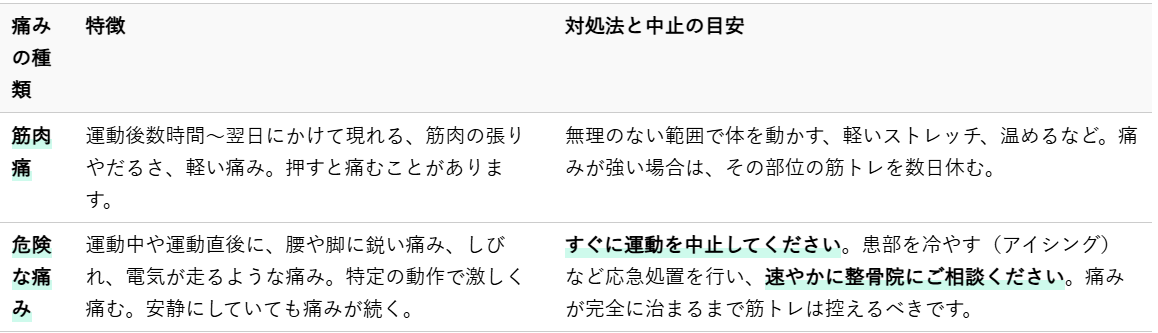痛みが治まってから運動を再開する際も、以前よりも負荷を下げて様子を見ながら行うようにしましょう。以下の表は、痛みの種類と対処法、中止の目安をまとめたものです。