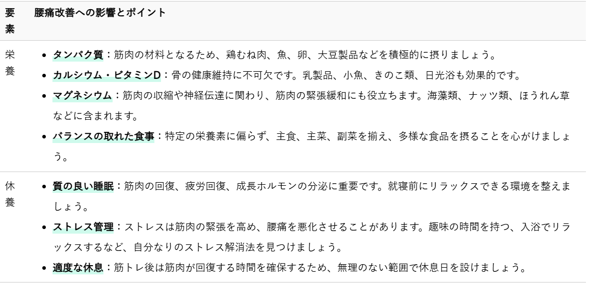 食事や睡眠は、日々の健康を支える土台です。筋トレと合わせて、これらにも意識を向けることで、より効果的な腰痛改善が期待できます。