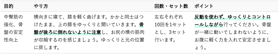 クラムシェルは、股関節の外側にある中臀筋(ちゅうでんきん)を鍛えるのに効果的なトレーニングです。中臀筋は、歩行時の骨盤の安定や、片足立ちの際に体がぐらつくのを防ぐ重要な役割を担っています。