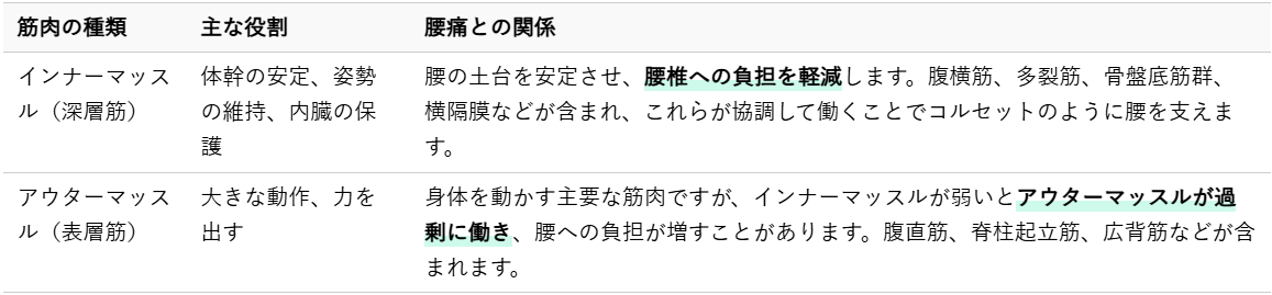 腰痛改善の鍵は、単に筋肉を鍛えるだけでなく、インナーマッスルとアウターマッスルの両方をバランス良く鍛えることにあります。それぞれの筋肉が持つ役割を理解することが、効果的な筋トレへとつながります。