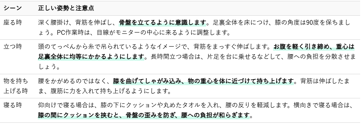 これらの姿勢や動作を意識するだけでも、腰への負担は大きく変わります。日々の生活の中で、ご自身の姿勢を振り返り、改善できる点がないか確認してみてください。