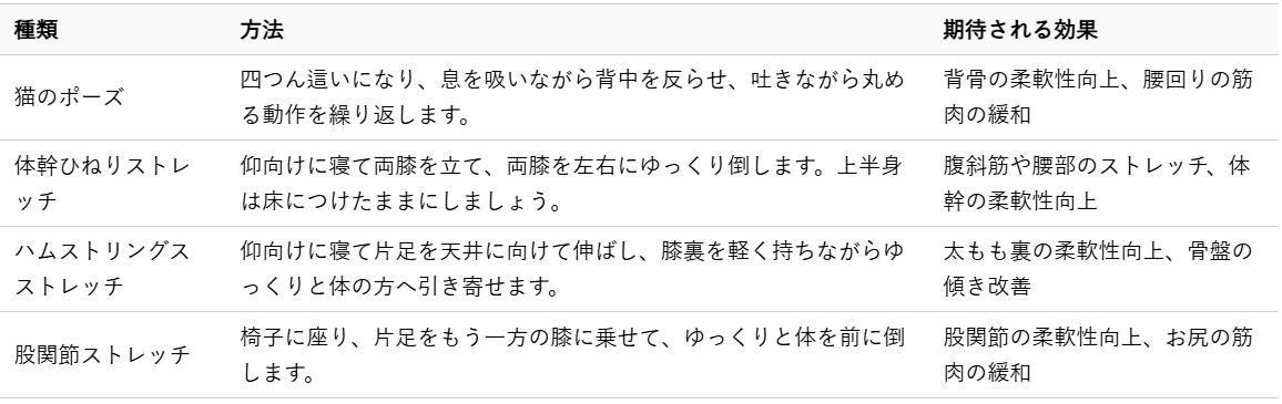 凝り固まった筋肉をほぐし、血行を促進するストレッチは、腰痛対策の基本です。呼吸を意識しながら、ゆっくりと気持ち良い範囲で行いましょう。
