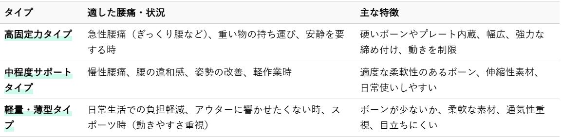 また、腰痛の種類によっても選び方は変わります。急性期の強い痛みには高固定力タイプ、慢性的な腰の違和感には日常使いしやすいサポートタイプ、骨盤の不安定さが原因の腰痛には骨盤を安定させるタイプなど、ご自身の腰痛の根本原因や症状に合わせた選択が重要です。