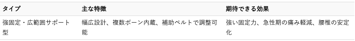 ぎっくり腰のような急性期の強い痛みや、重いものを持つ作業などで腰に大きな負担がかかる際には、強力な固定力で腰椎の動きを制限し、安定性を高めるタイプが推奨されます。