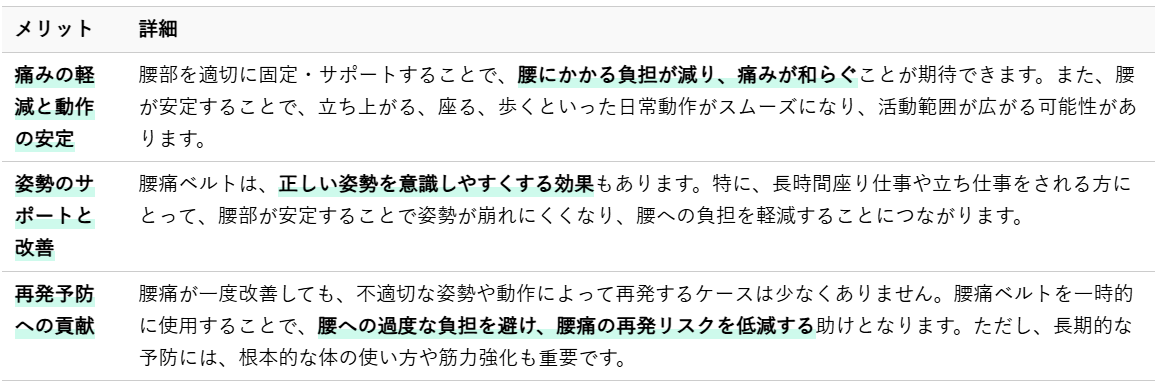 腰痛ベルトの役割を理解した上で、具体的にどのようなメリットが得られるのかを見ていきましょう。