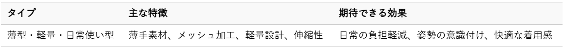 デスクワークや立ち仕事、家事など、日常生活の中で腰の負担を感じる方には、目立ちにくく、長時間の着用でも快適性を保てる薄型・軽量タイプがおすすめです。
