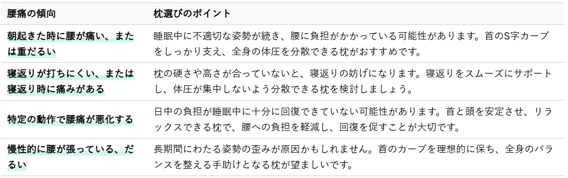 一口に腰痛と言っても、その原因や症状は様々です。ご自身の腰痛のタイプを理解することが、適切な枕選びの第一歩となります。ここでは、いくつかの腰痛の傾向と、それに応じた枕選びのヒントをご紹介いたします。