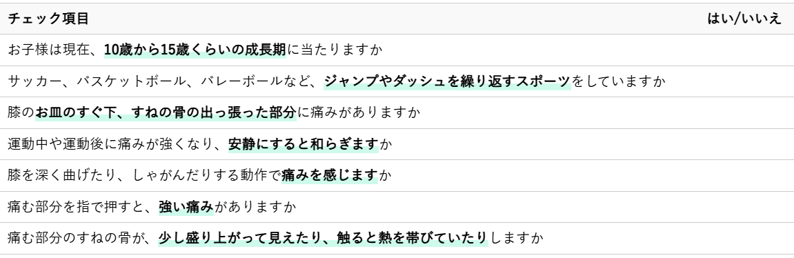 ご自宅でできる簡単な自己チェックで、お子様の膝の痛みがオスグッド病の可能性があるかどうかを見分けることができます。以下のチェックリストに当てはまる項目が多いほど、オスグッド病の可能性が高まります。