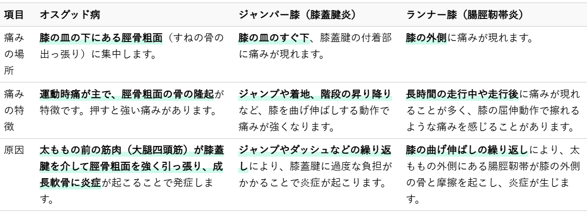 オスグッド病と同様に、スポーツ活動によって引き起こされる膝の痛みとして、ジャンパー膝(膝蓋腱炎)やランナー膝(腸脛靭帯炎)があります。これらの疾患もオスグッド病とは異なる特徴を持ちます。