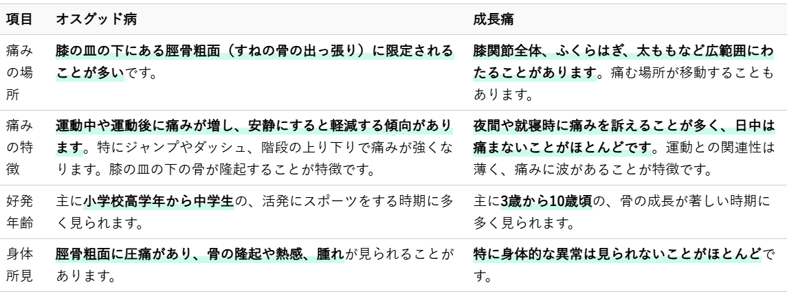 成長痛もまた、成長期のお子様によく見られる膝の痛みです。しかし、オスグッド病とは異なる特徴があります。両者の主な違いを以下の表にまとめました。
