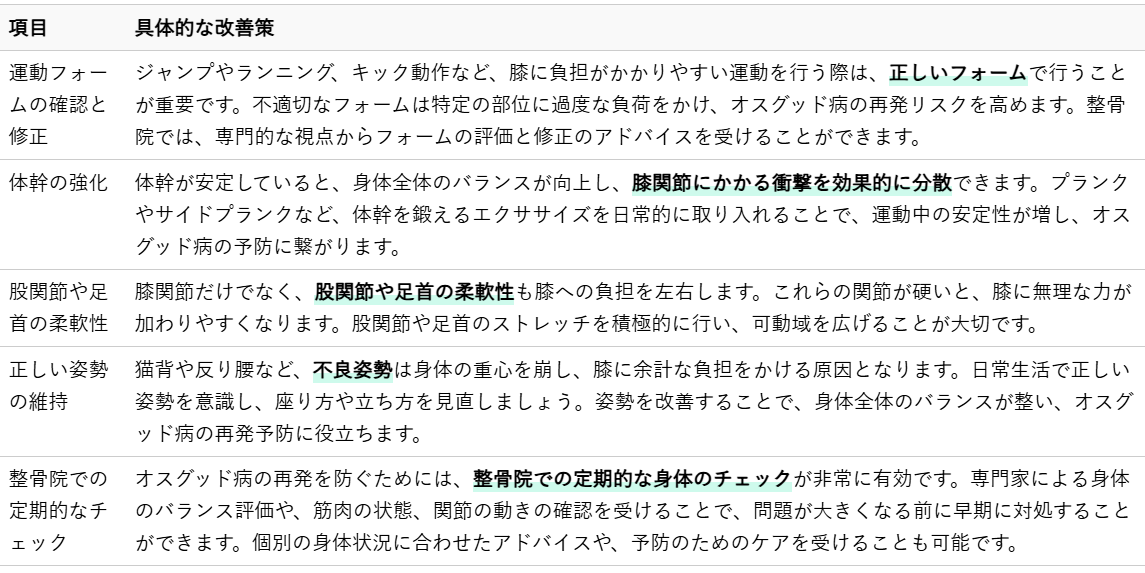 オスグッド病の再発を防ぐためには、日々の生活習慣や運動への取り組み方を見直すことが重要です。膝への過度な負担を避け、身体の成長とバランスを考慮したケアを心がけましょう。
