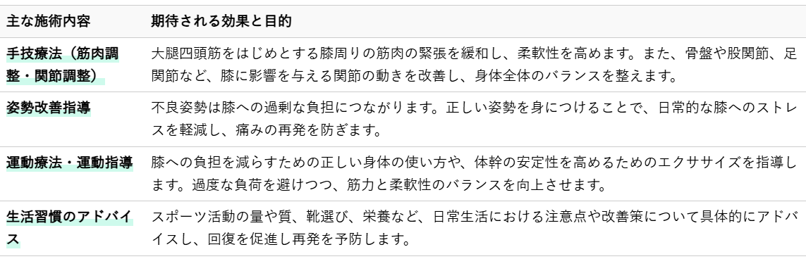 オスグッド病と診断された場合、その痛みや症状を和らげるだけでなく、根本的な原因にアプローチすることが大切です。整骨院では、痛みのある患部への直接的な施術に加え、身体全体のバランスを整え、再発を防ぐための多角的なアプローチを行います。