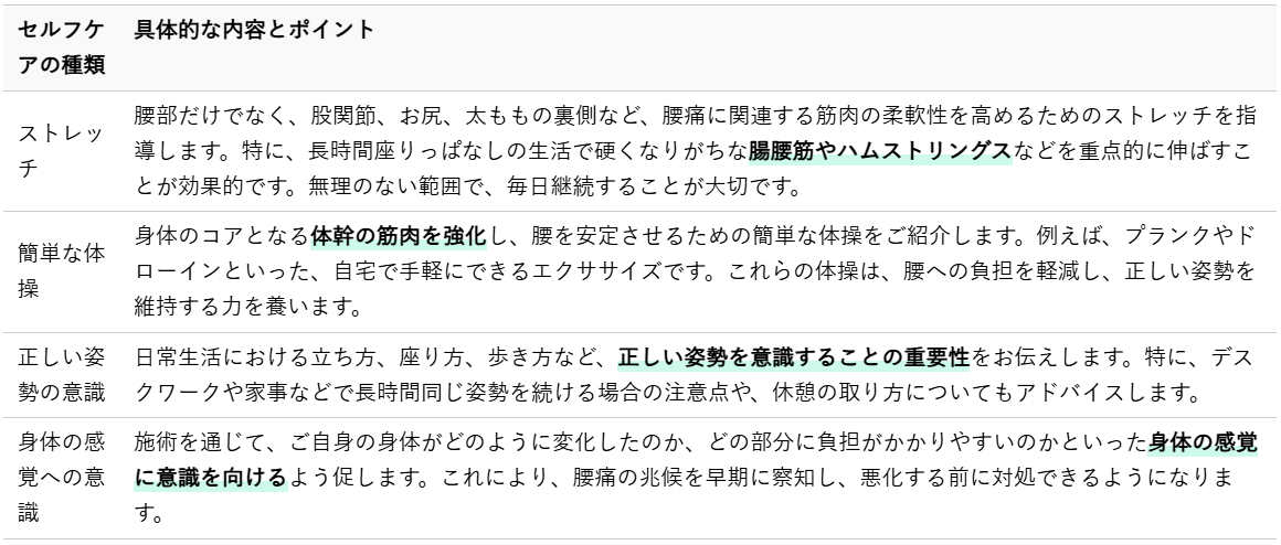 カイロプラクティックの施術は、腰痛の根本原因にアプローチし、身体のバランスを整えるための重要なステップです。しかし、その効果を最大限に引き出し、改善した状態を維持し、再発を防ぐためには、お客様ご自身による日々のセルフケアと生活習慣の見直しが不可欠です。